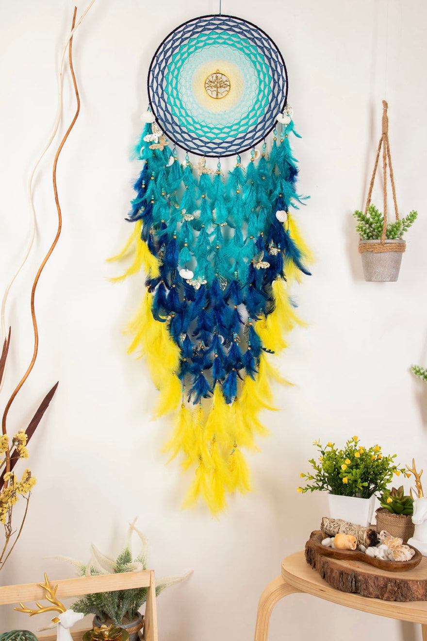 This product is available on pre order. It gets dispatched 12 days after placing order.The joy of the first drizzle to watching the rainbows sparkle , monsoon is all about magic and inspiration ! This monsoon magic Dreamcatcher crafted in shades of turquoise and green with a pinch of yellow is the perfect addition to add a burst of colours in your space designed to create abundance , harmony and abundance wherever she goes.
