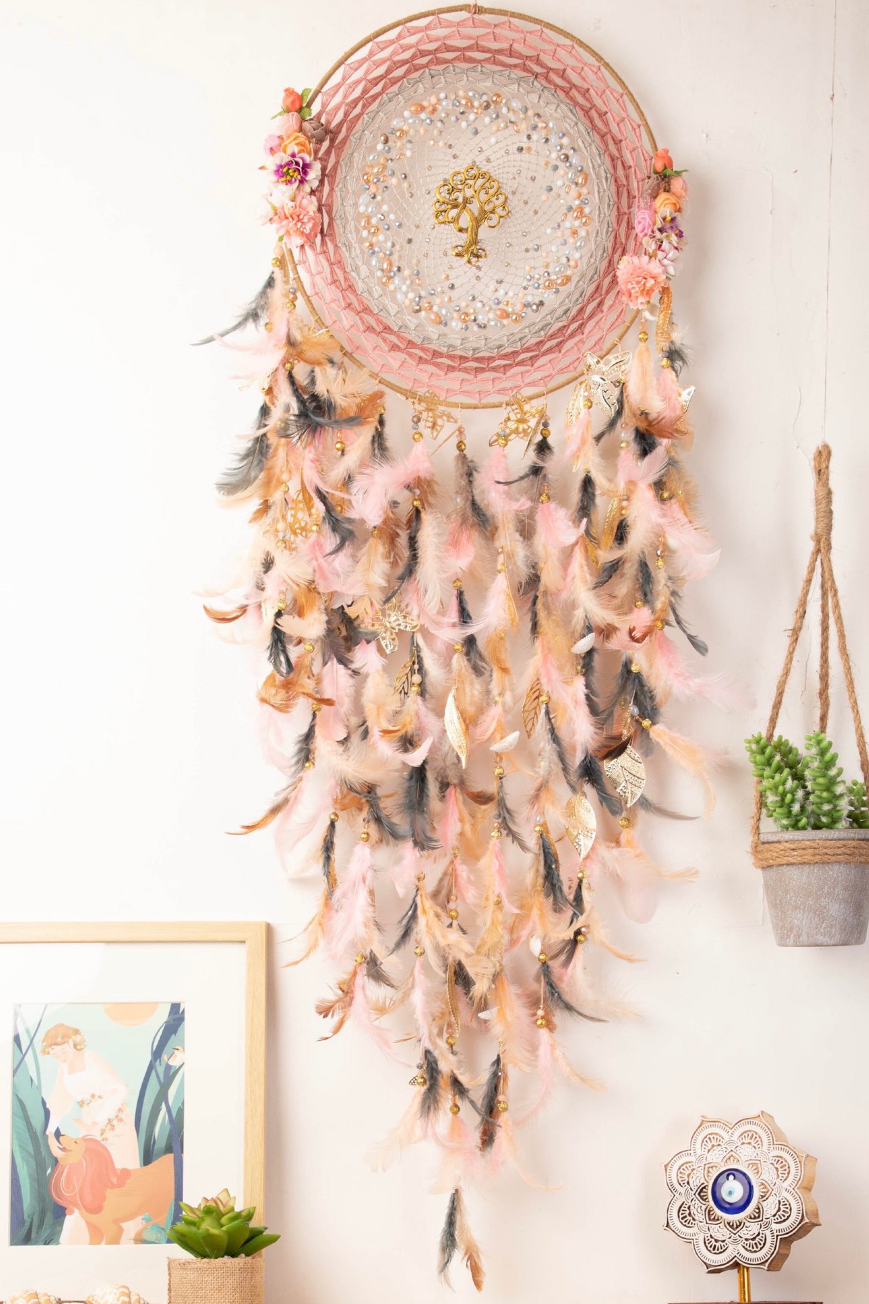 This pastel galaxy is crafted in gentle shades of peach and light greys to nurture those pure innocent dreams . With premium quality glass crystal beads and a tree of life at its centre, it creates the perfect balance of good vibes meets elegant beauty. It’s sight brings smiles, ease and gentleness and becomes the perfect spot to start your day by, humming to music, smiling as you sway in its warm embrace.