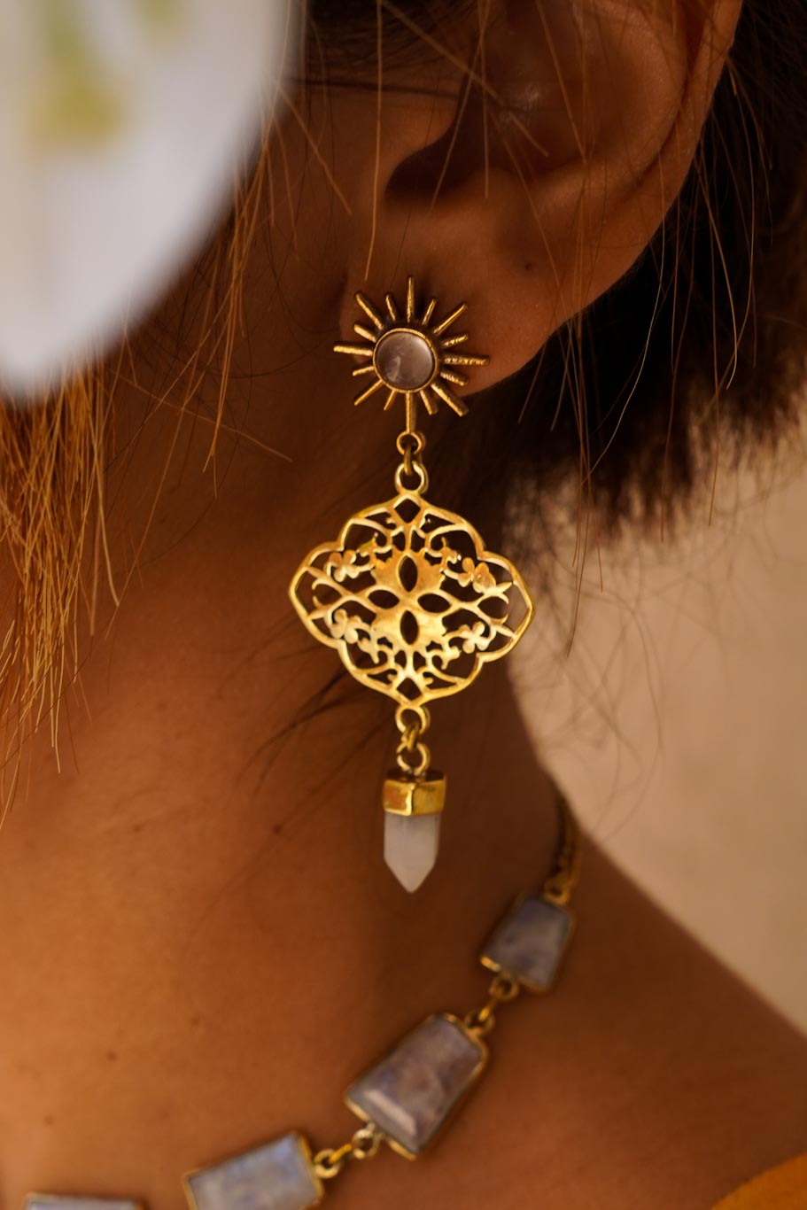 • Handcrafted brass earrings with detailed sunburst and authentic moonstone