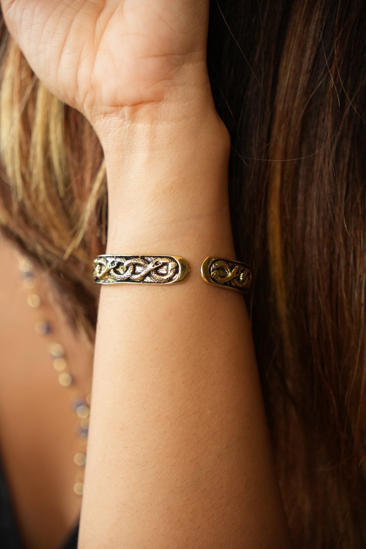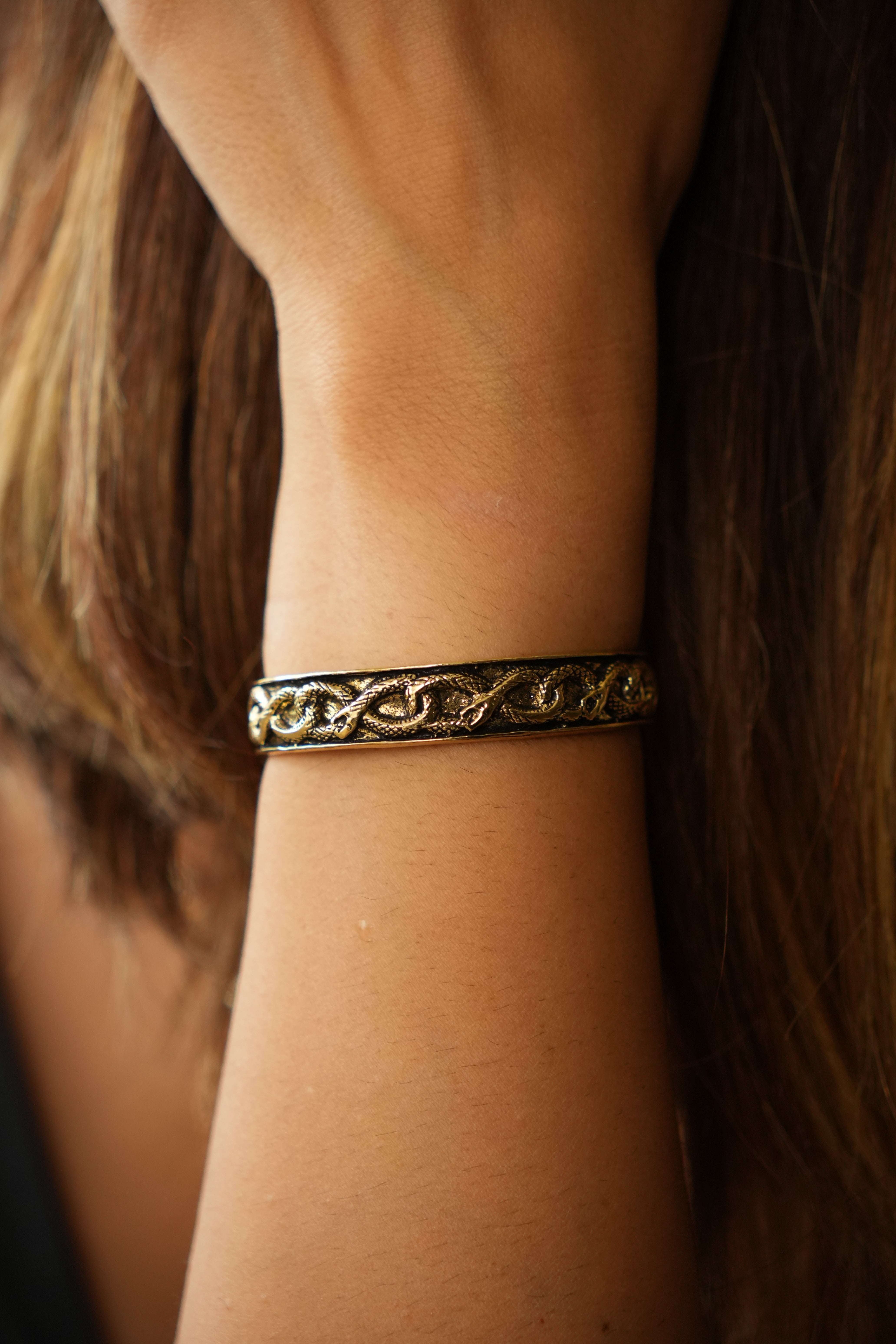 Avoid wearing your brass jewellery while bathing, as shampoos and soaps contain chemicals that may react with the metal. Keep it away from moisture, chemicals and perfume to preserve its natural shine.