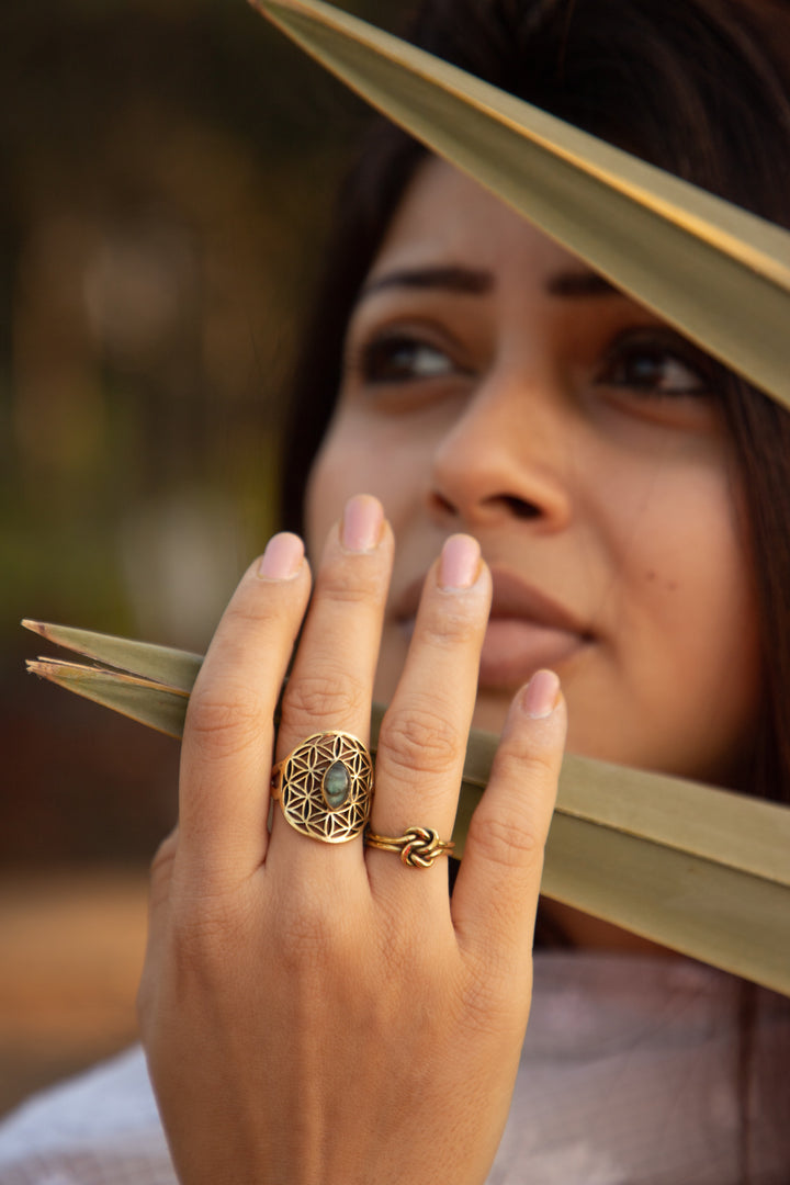 Labradorite flower of life adjustable brass ring. Size 5-7