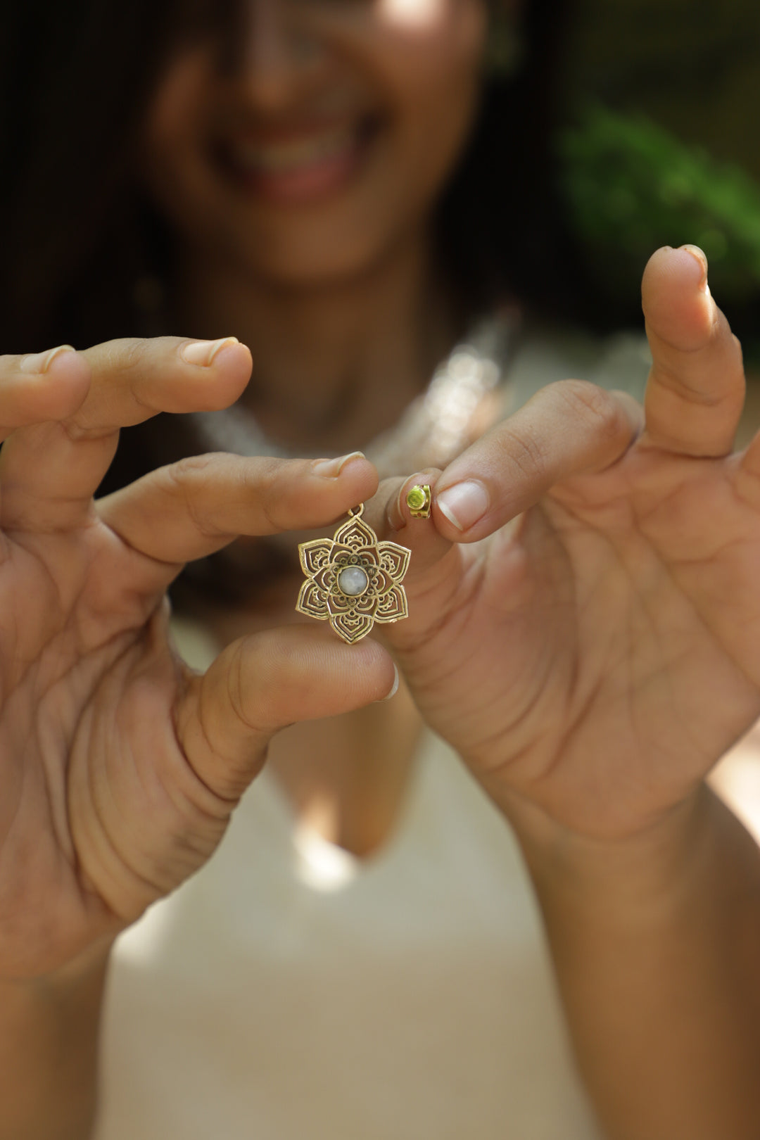 • Symbolic interpretation: Mandala for Divine Harmony, Moonstones for Purity.