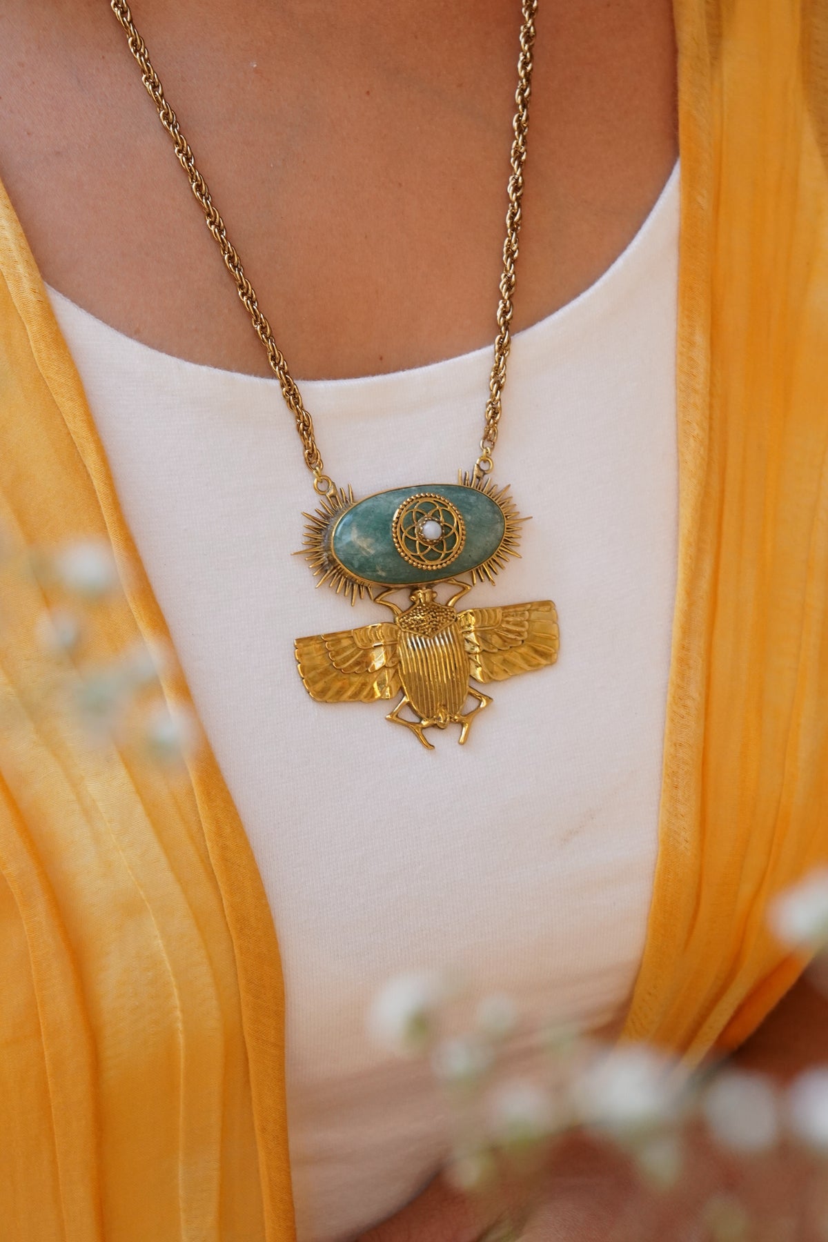 Scarab long chain with aquamarine