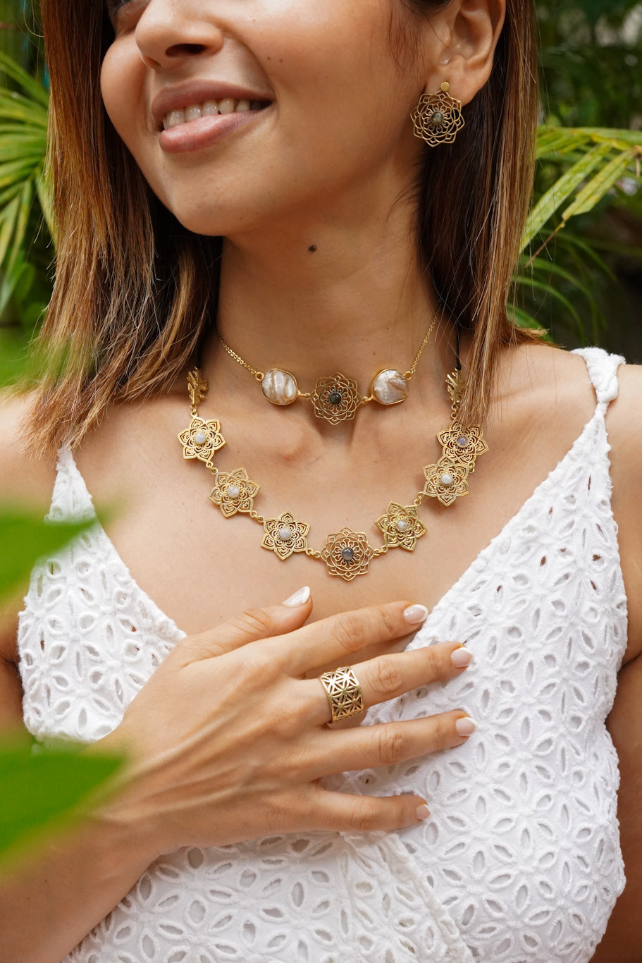 •  Wear it as you like it. Multipurpose brass accessory for those who enjoy wearing their jewellery in so many ways. Crafted with a cotton string back for comfort wear.