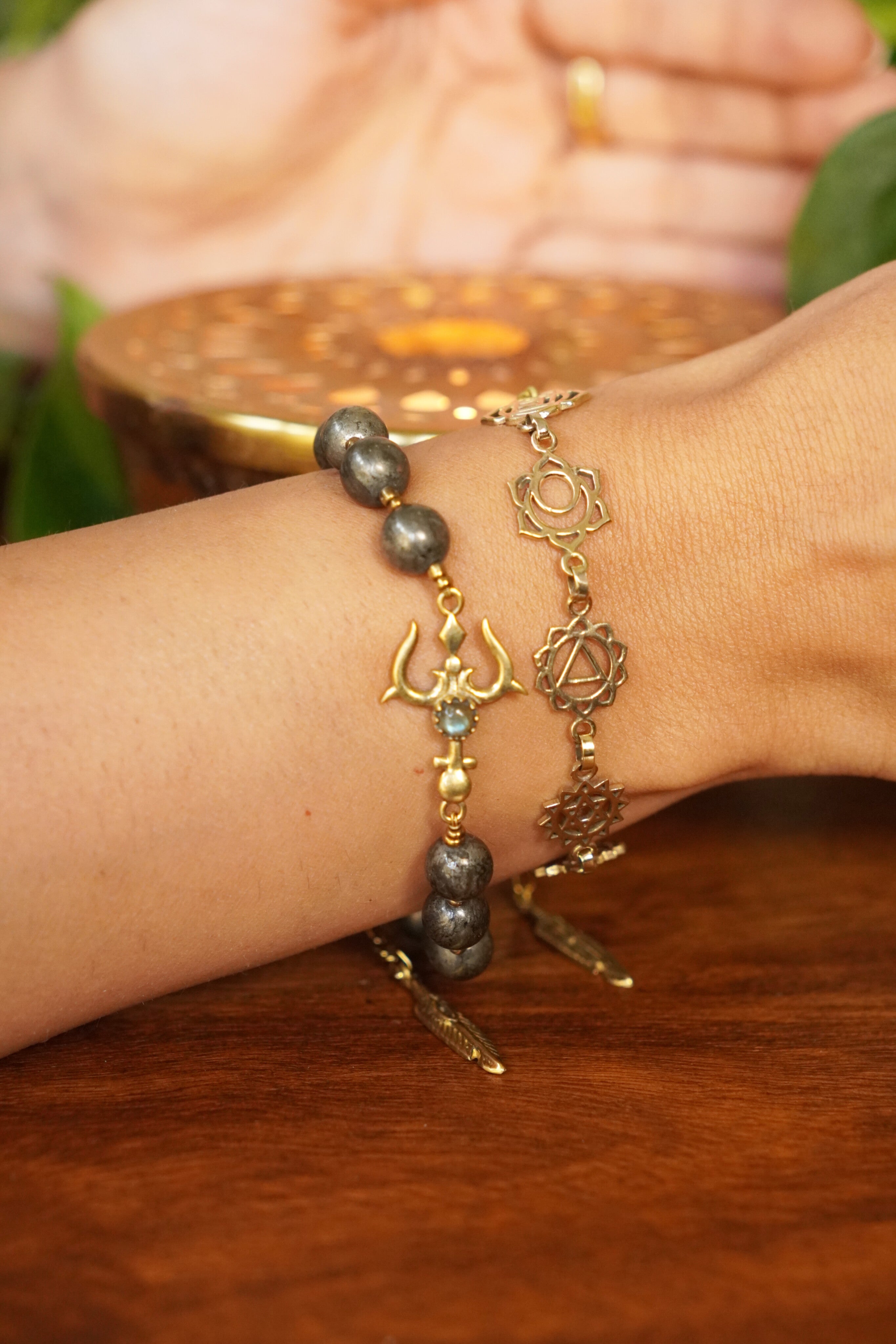 This stackable bracelet set contains 1 pyrite (for abundance) trishul bracelet + 1 seven chakra bracelet. Our sacred crystal bead bracelets are handcrafted with intention, combining the healing power of crystals with the symbolism of sacred brass charms. Each bracelet features: