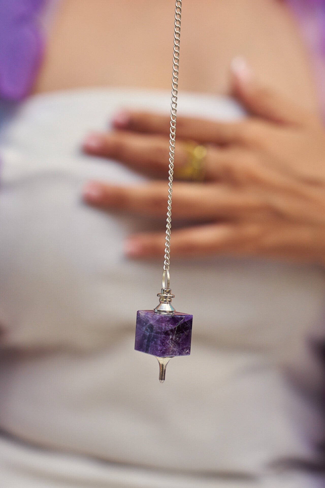 Amethyst crystal with alloy chain come together to dance to the divine guidance! Authentic crystal pendulums for light workers!