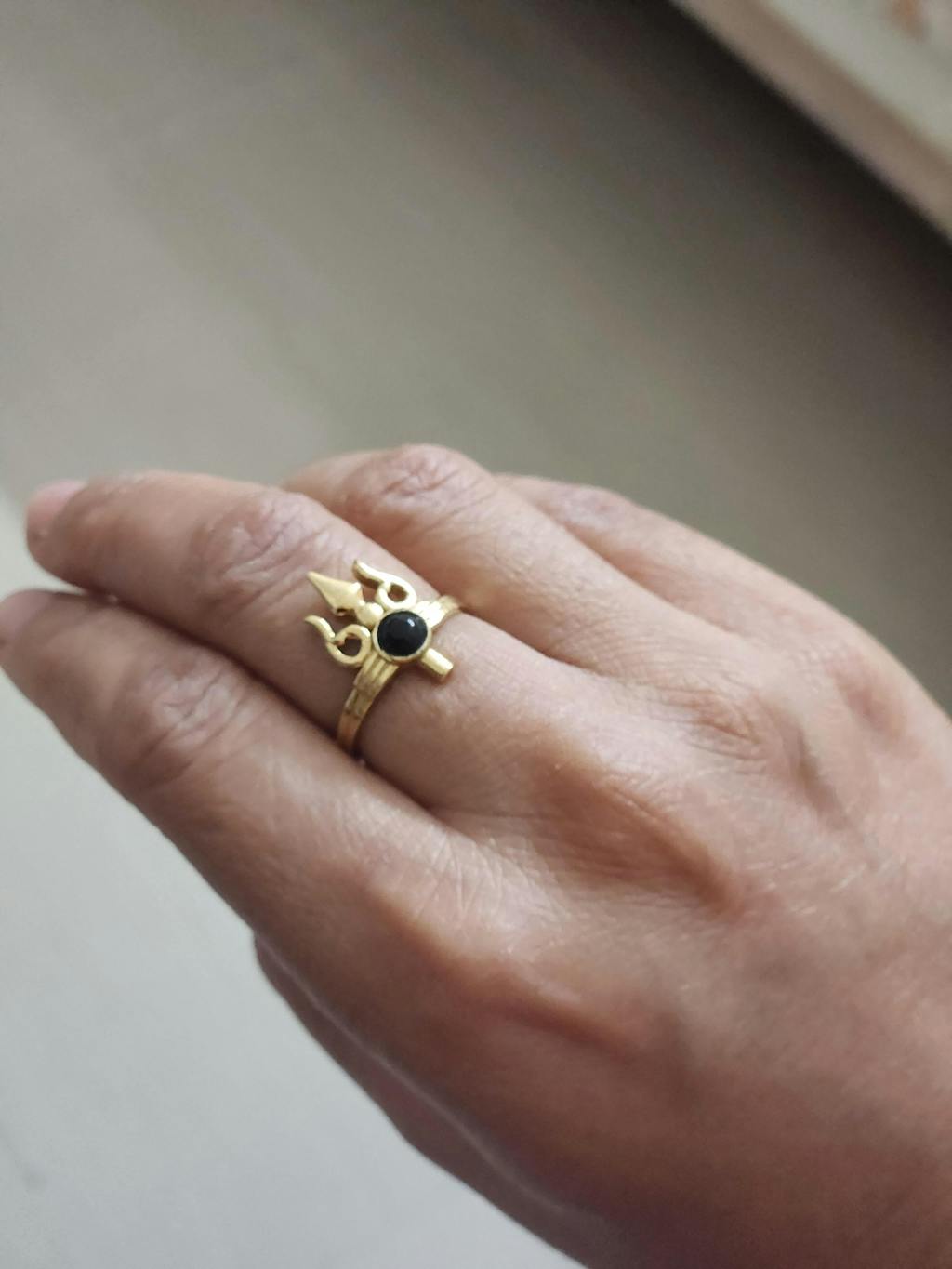 Trishul black agate brass ring- adjustable. Size 5-8