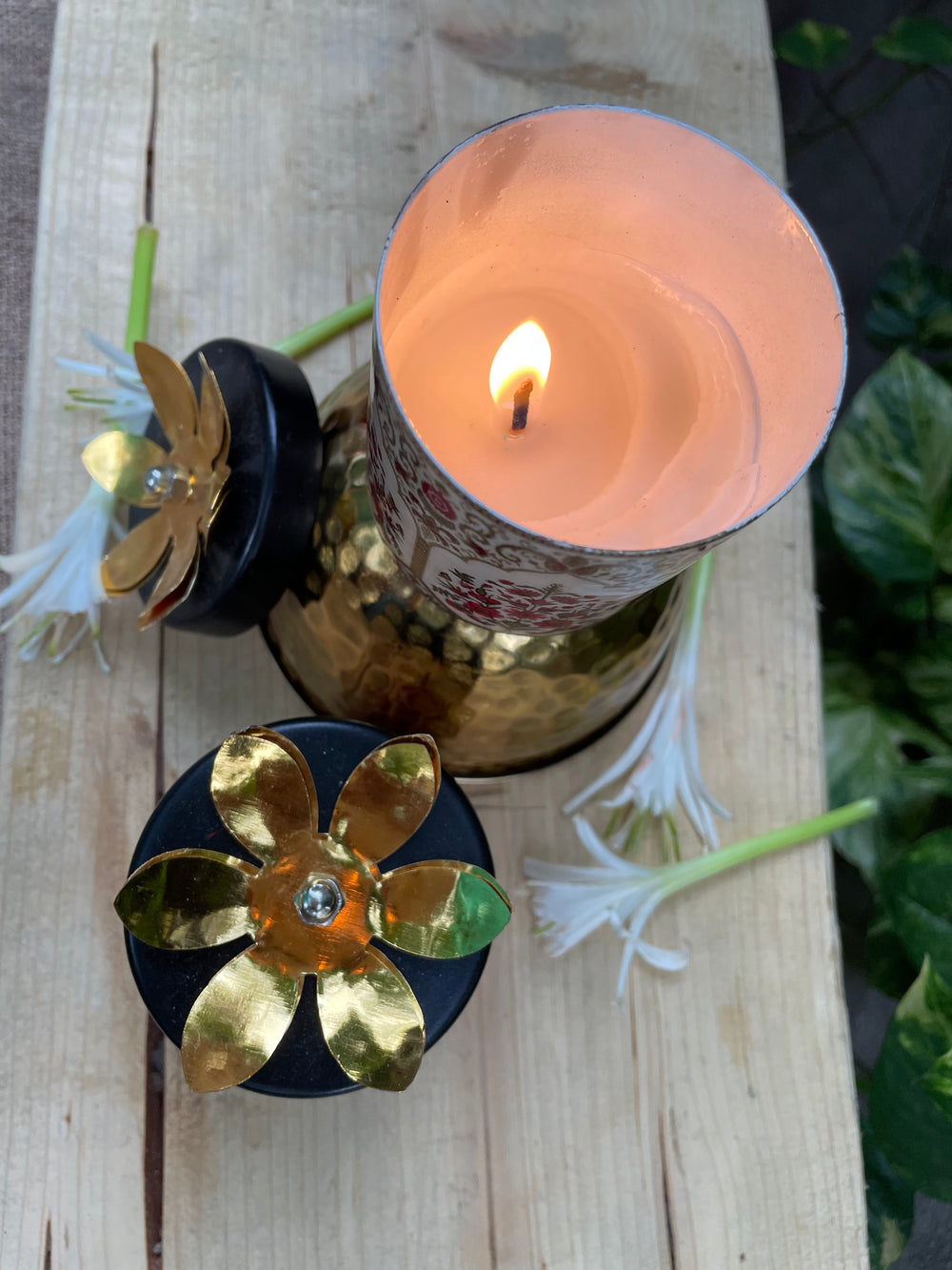 Gorgeous mogra scented candles to light up your home. Metal containers can be reused to save your precious knick knacks!