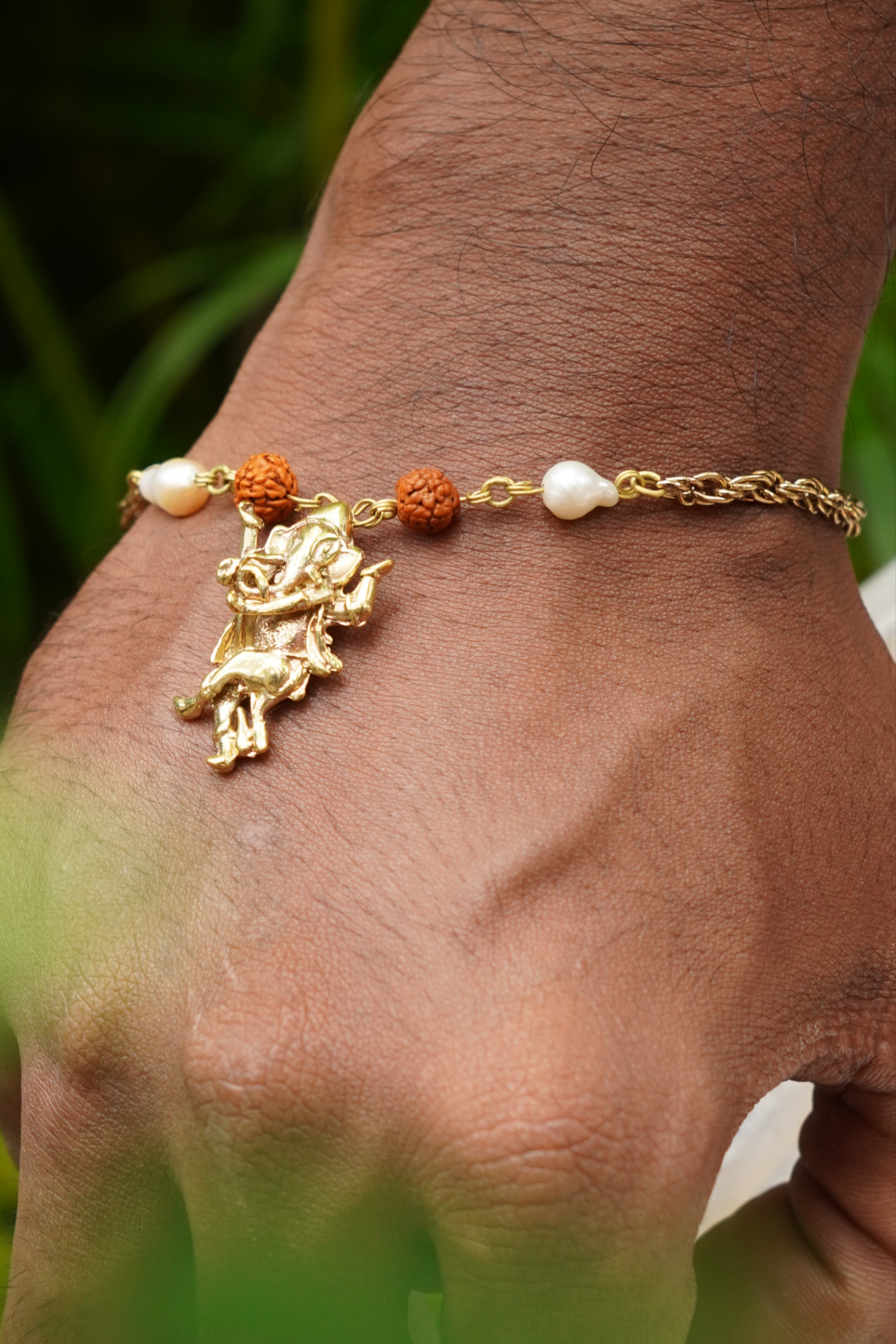 Rudra Ganesh is handcrafted bracelet using the finest authentic panchmukhi rudraksh seeds with pure brass ganesha and aurhentic river pearls for creating the most sacred symbolic jewellery.