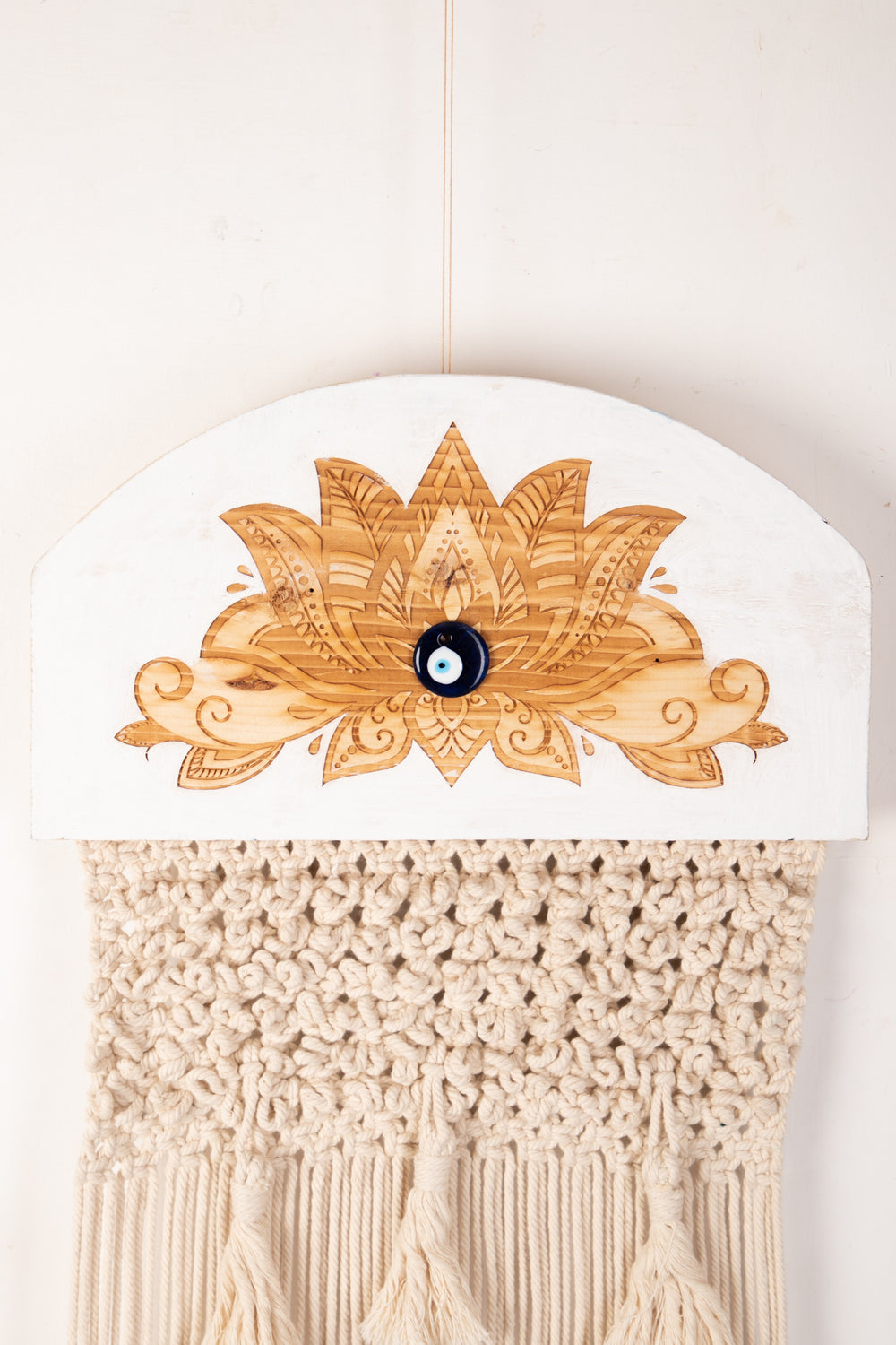 Macrame finds a new fusion with wood panel laser engraved with lotus motif to embody the spirit of purity transformation and compassion . This hanging is an ideal choice to place in any area that you wish to become your cosy corner. By the window, the dining or the floor sit out - so many places to hang this beauty.
