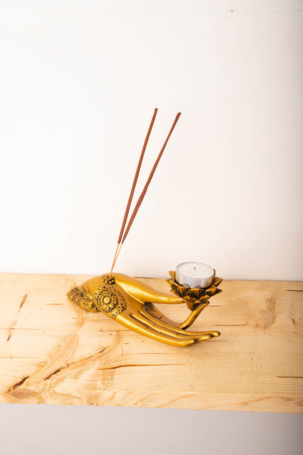 Fibre cast mudra candle and incense stick holder is an authentic design crafted by Soul Works inspired by the mudra (hand gestures) of lord Buddha . This specific mudra called Chin mudra is a metaphor of the union of the individual soul with the supreme soul. Mudra means seal, and it is essentially an energetic and spiritual gesture that controls the flow of energy within the body.