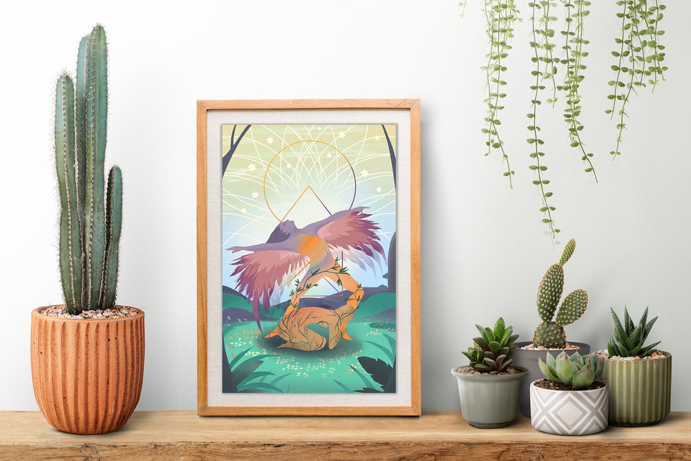 The new vision illustration is inspired from the Osho deck of tarot cards. It embodies the spirit of rising above yourself. Spread your wings and take flight to discover the best version of you, one that is connected to your higher purpose as you raise your vibration with this energised artwork.