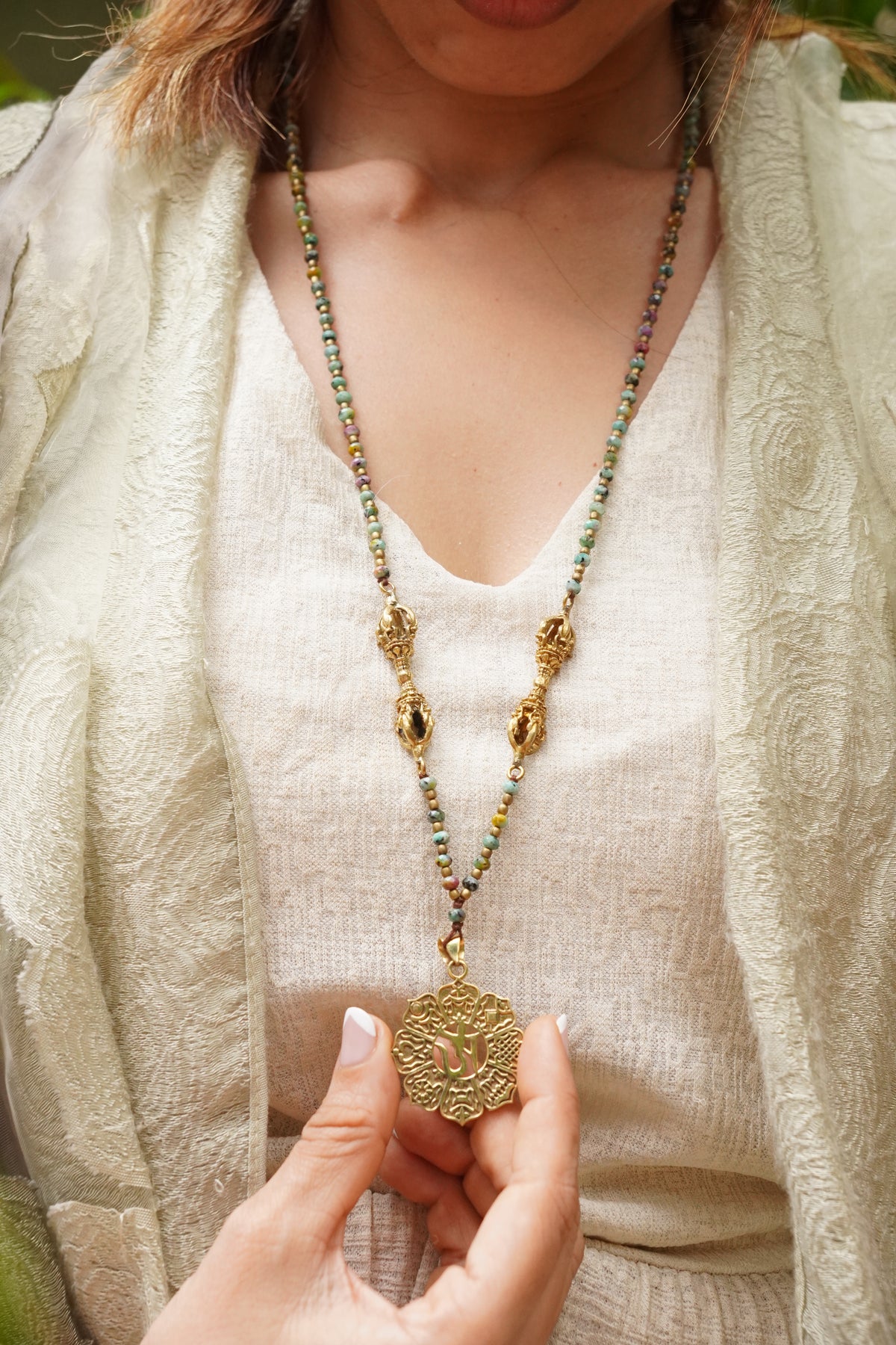 • Handcrafted 108-beaded crystal maalas with brass Om Detailing and brass Vajra, crafted inspired by traditional chanting maalas.